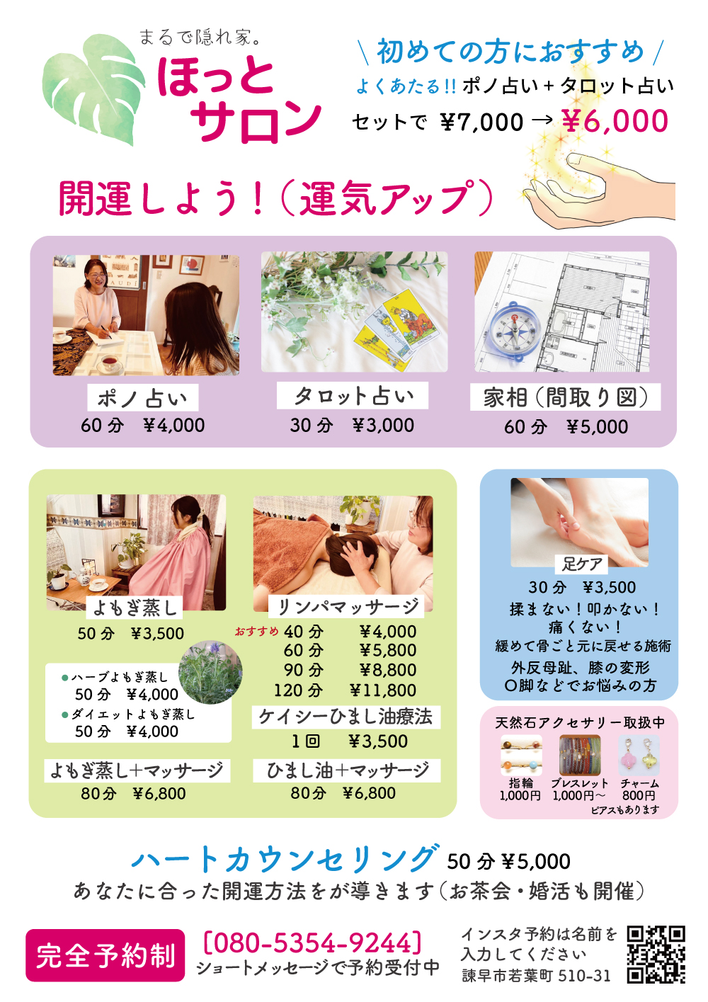 | ご利用について | ほっとサロンは、完全予約制です。 ※接客中は電話に出ることが難しいため、ショートメッセージでお問い合わせください。 |